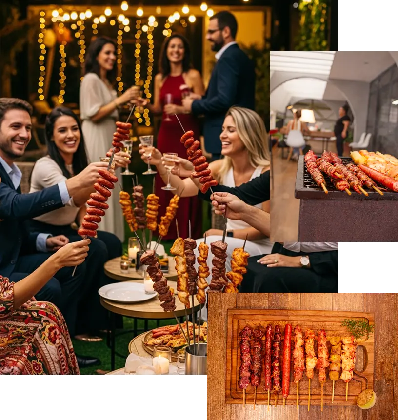 Composição: Espeto Bovino (500g) + Espeto Linguiça (500g) + Espeto Coração (500g) + Espeto Peito (500g) + Bolsa Térmica.